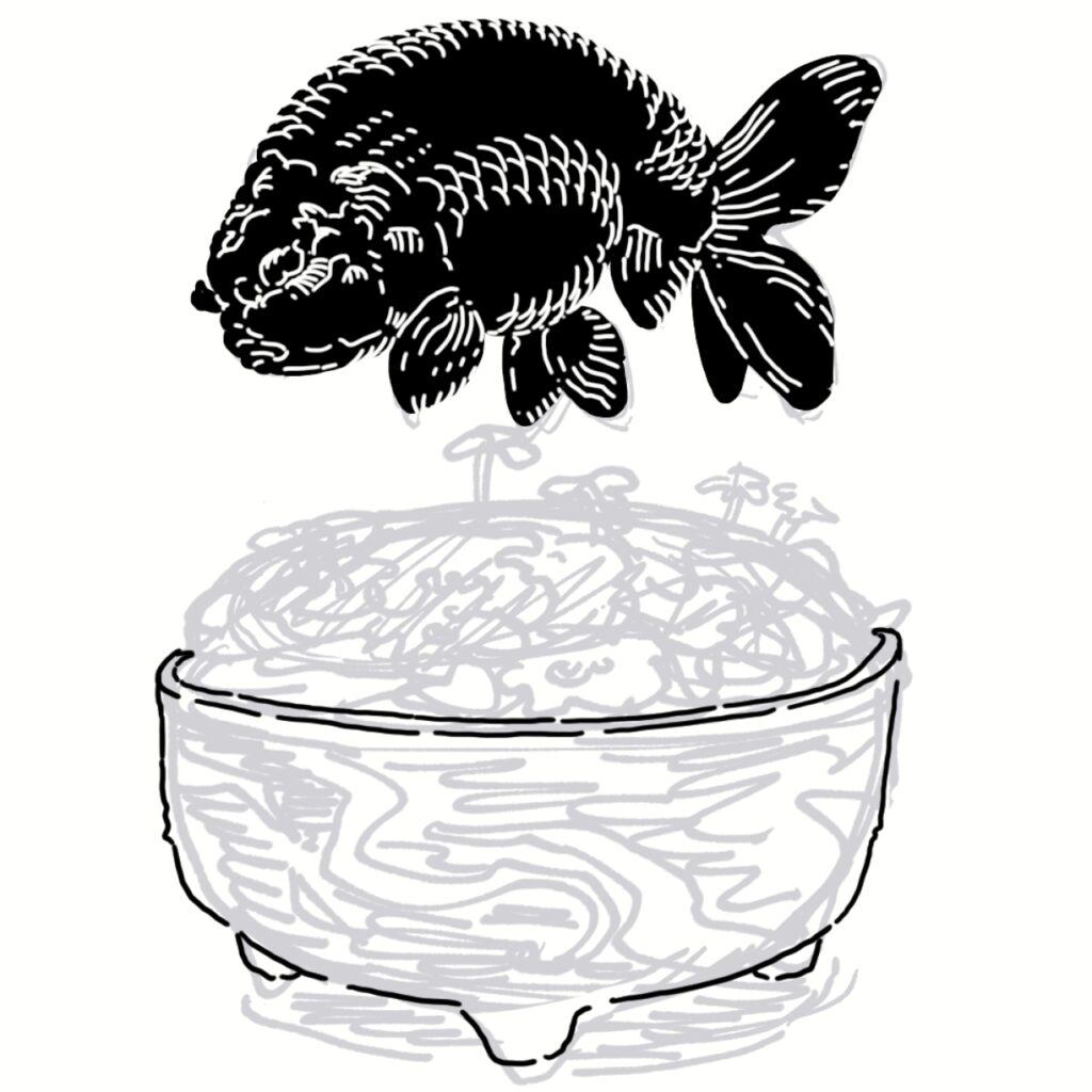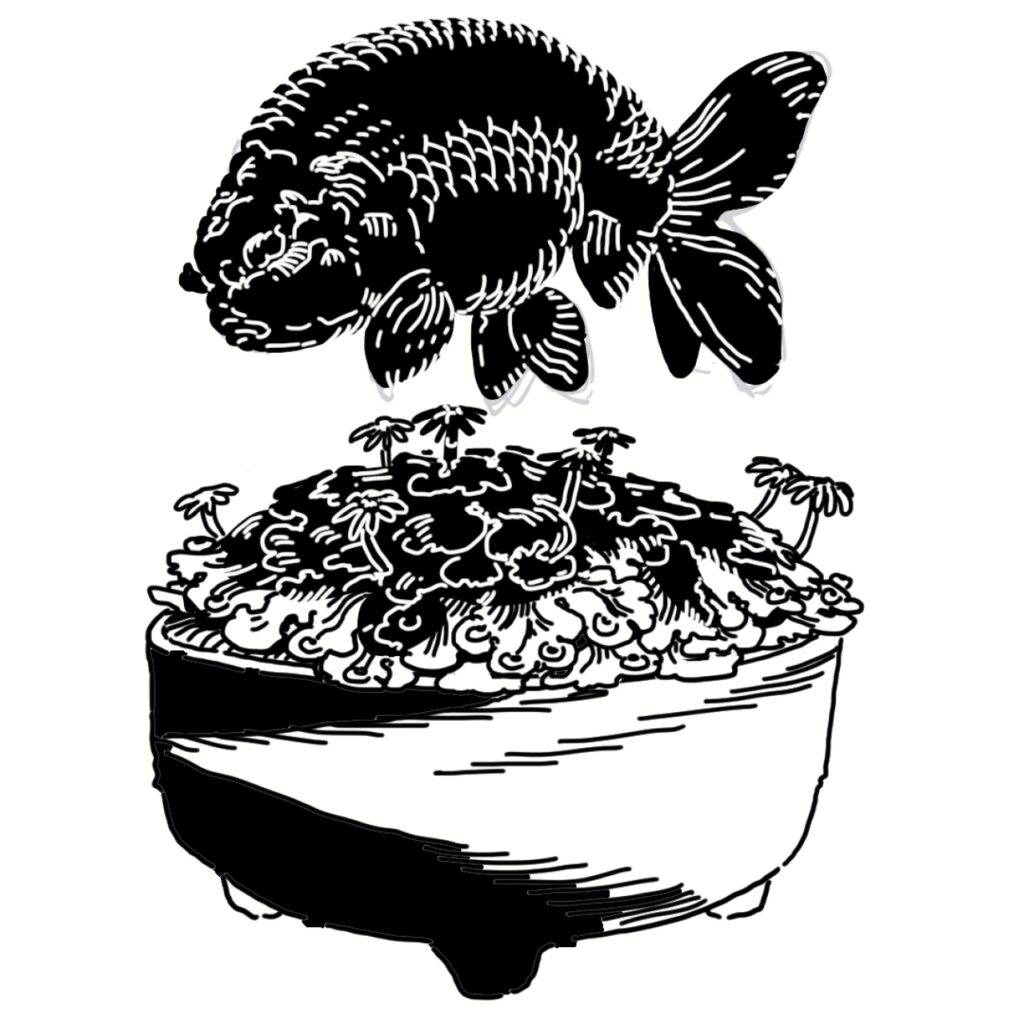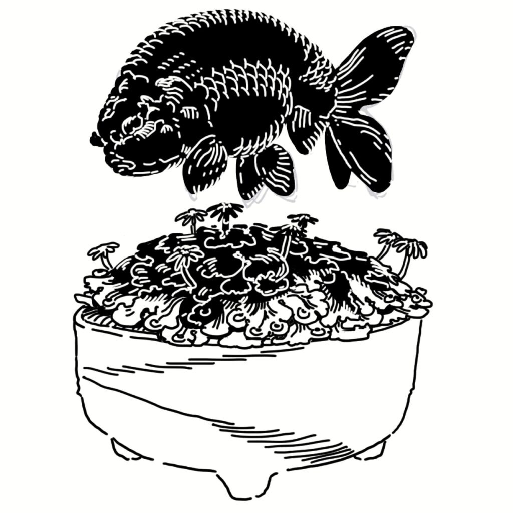 「うろこ雲」が黒らんちゅうを指すこと,盆栽の「自然のミニチュア」という側面を端的に示すために,黒らんちゅうの影が苔盆栽に落ちるという構図とします.