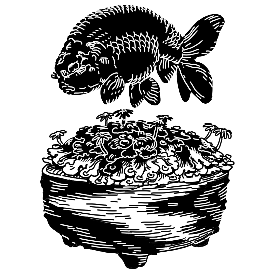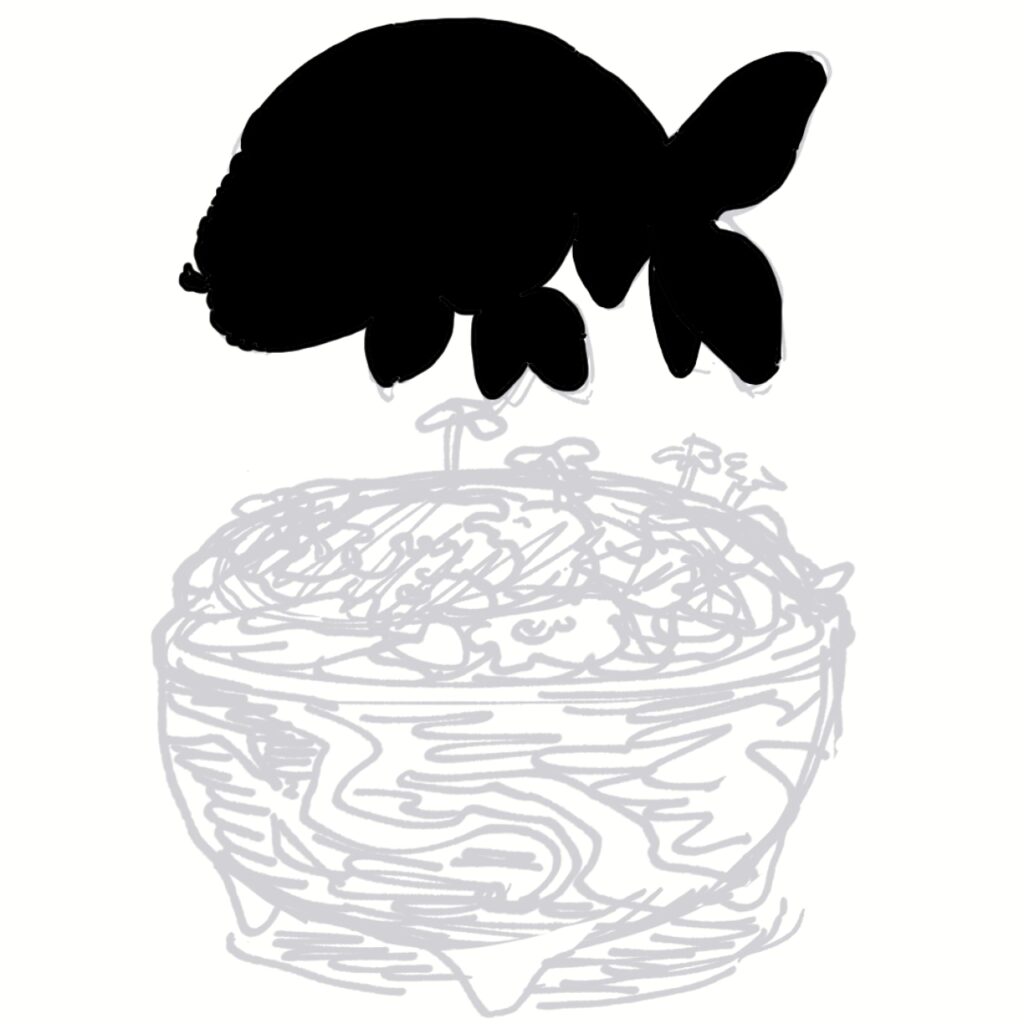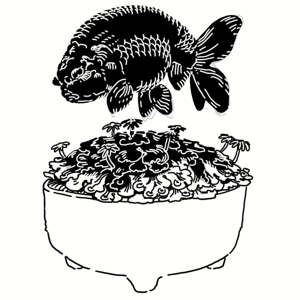 「うろこ雲」が黒らんちゅうを指すこと,盆栽の「自然のミニチュア」という側面を端的に示すために,黒らんちゅうの影が苔盆栽に落ちるという構図とします.