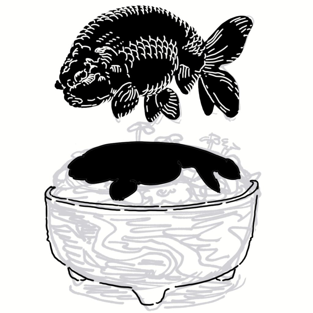 黒らんちゅうは肉瘤の発達によって目隠れになる,あるいは瞳孔以外の部分を覆ってしまって目がどこにあるのやら分からなくなるケースが多い品種のため,はっきりと目玉を書かない構成とします.