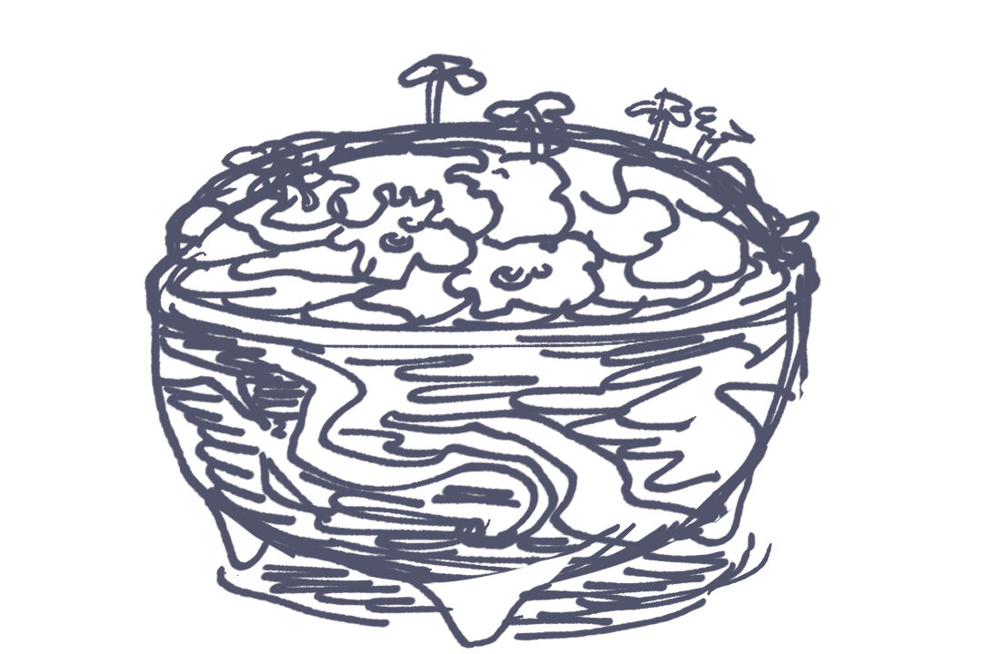 まず苔盆ですが,苔と一口に言っても種類が様々で,中には芝などと見分けのつけづらい,イラストに起こすと形が判然としないような種類もおりますから,一目で苔とわかるよう種類を選ぶ必要があります.