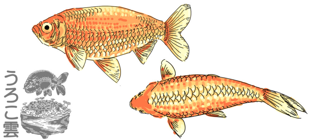 背びれがなくなる突然変異があった和金の推定画.「マルコ」がこの通りの姿だったかは不明.