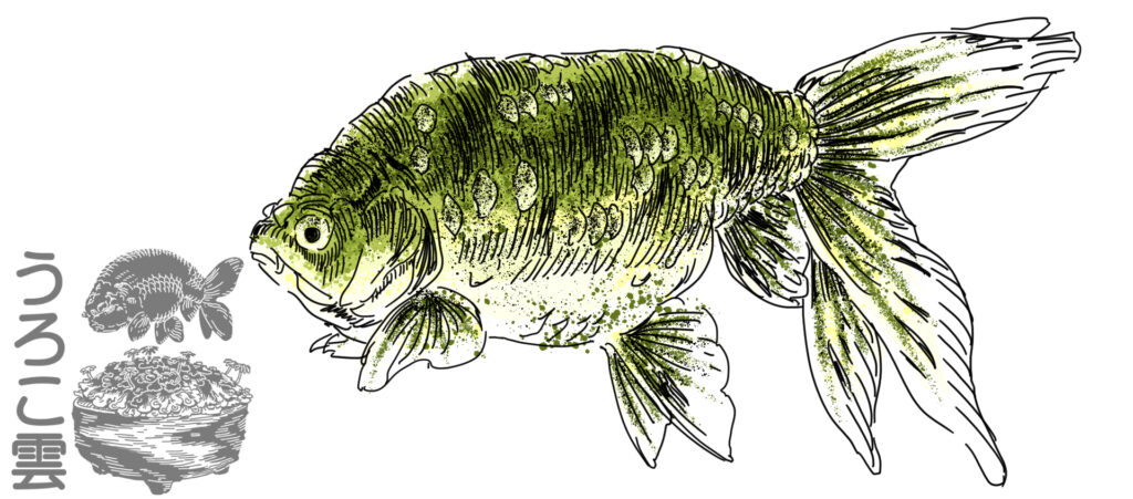 既存の金魚の体色として,黄色素胞が呈する黄色と,黒色を呈さないほどにまばらな黒の色素による青灰色,真皮層の黒色素胞と白い透明鱗が組み合わさった浅葱色があり,この組み合わせによって緑色が実現しているものと思われます.