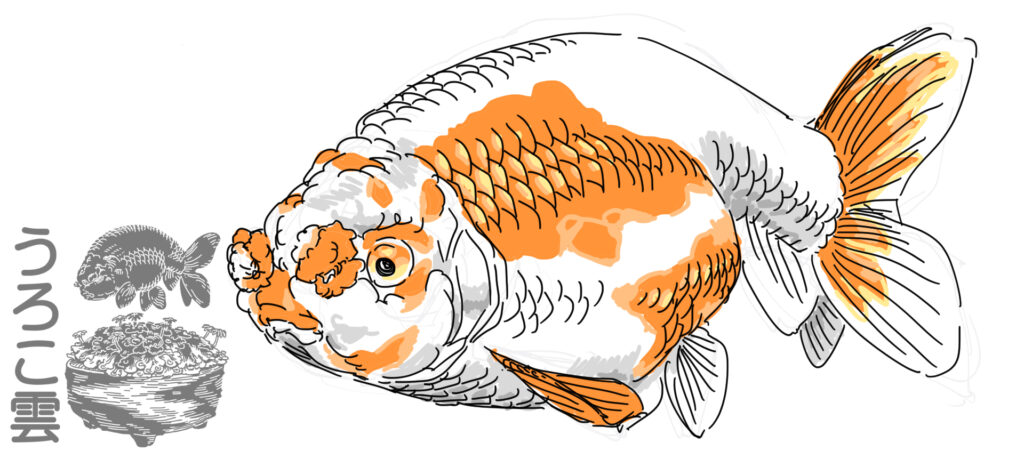 一般的ならんちゅうと異なり,肉瘤が薄いことと平付け尾,更紗柄の中でも赤の配置によって呼び名が変わる柄を鑑賞する金魚です.