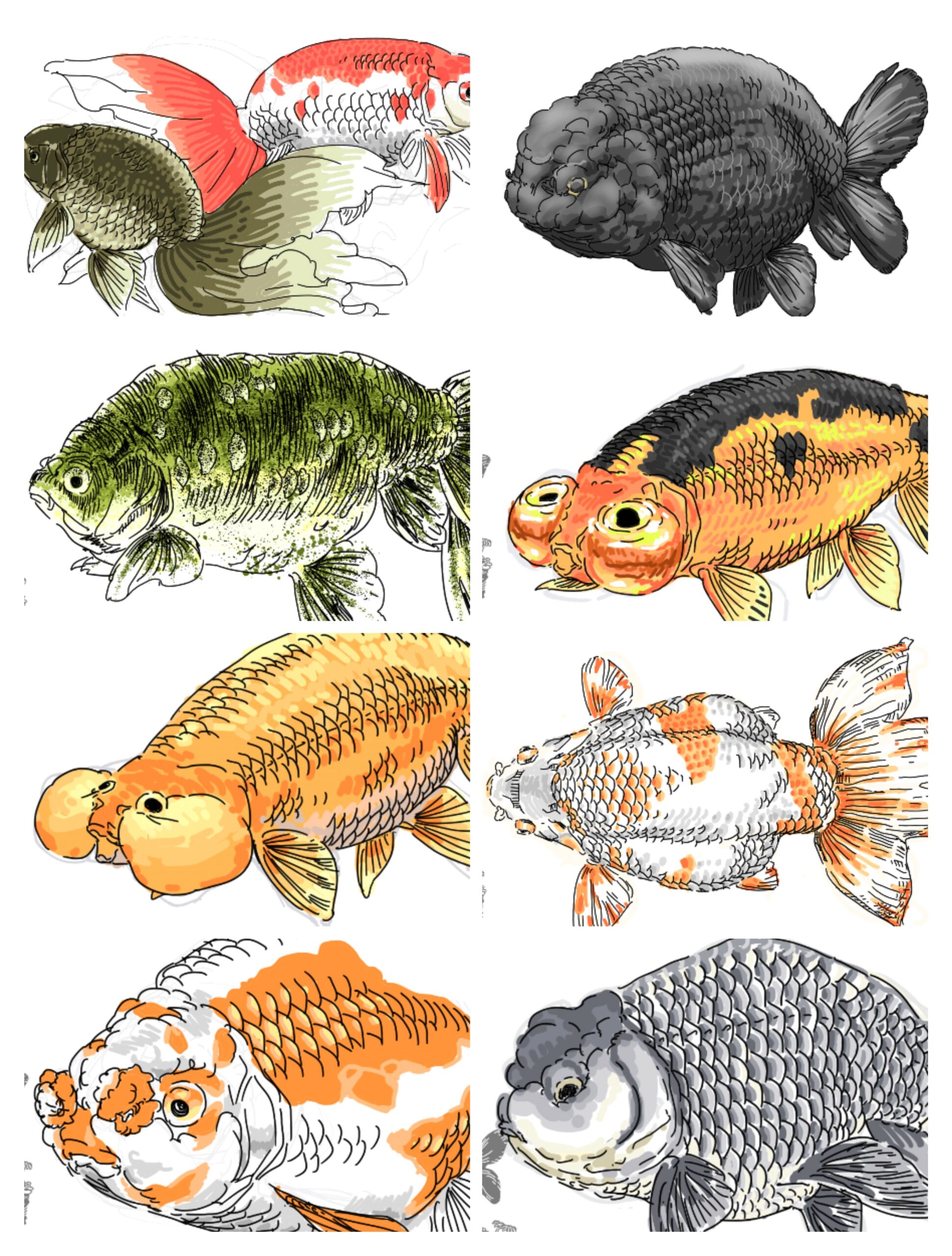 かつて存在したという「マルコ」から愛好が始まったとされるこの体型の品種は,水泡眼頂点眼のほか,平付け尾を持つ大阪らんちゅうのように上見に優れた特徴を持つ品種,丸っこい体型を評価され最近作られた品種など古今問わず愛され,新たな姿かたち・色味を探求されています.