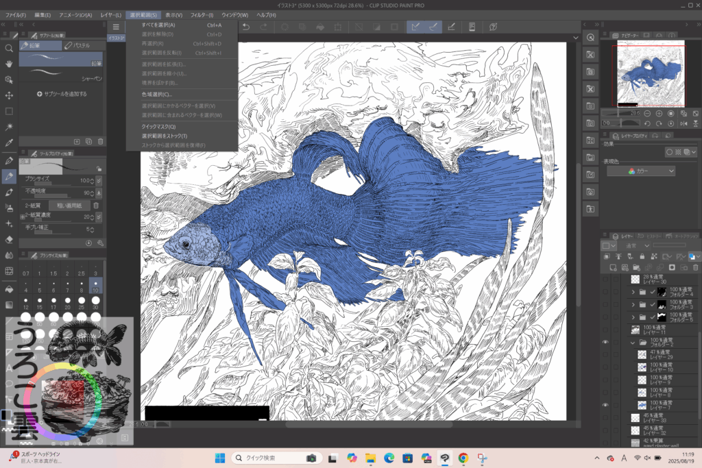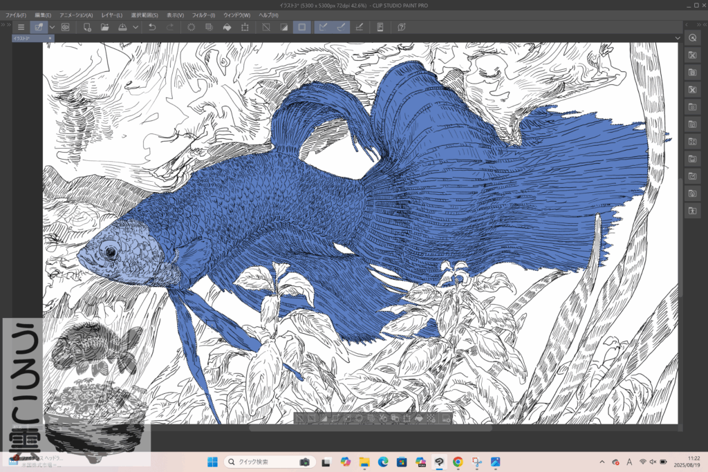 続いての水草の彩色でも,上記「レイヤーマスク」を活用して2種類の色分けを簡便にしつつ,それぞれの微妙な色,質感の違いにフォーカスしていきます.