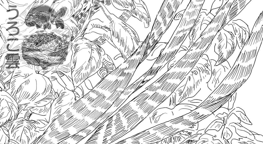 それぞれの水草は葉の形状から質感まで様々な相違があるため,線のゆがみにそれぞれ差をつけて描いていきます.