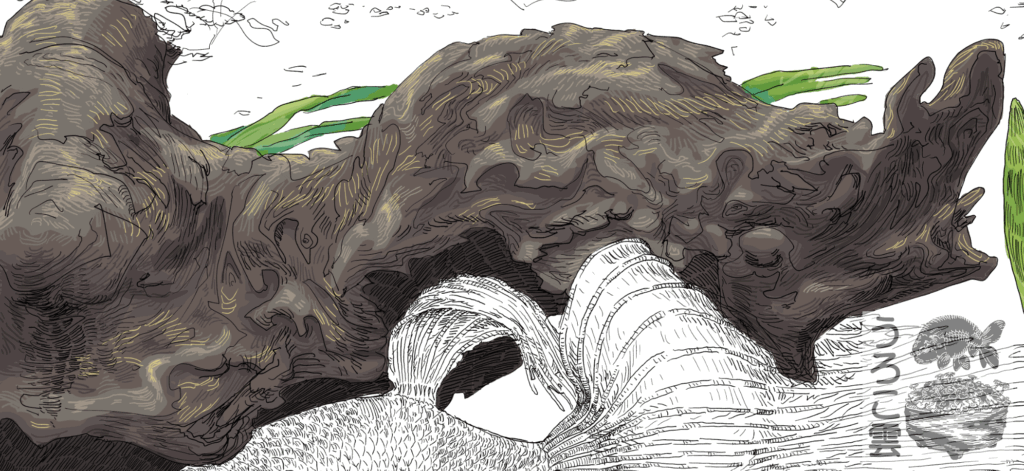 線画で表現するのは,ベタと流木,水草それぞれの質感の違いです.