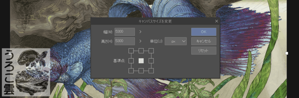 WAD2025に出展できる最大イラストサイズがS10号サイズ(530mm×530㎜)のため,十分な解像度で印刷できるようキャンバスサイズを5300×5300pxとします.