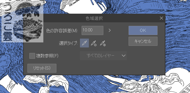 ウィンドウ左上部「選択範囲」より「色域選択」を選択.