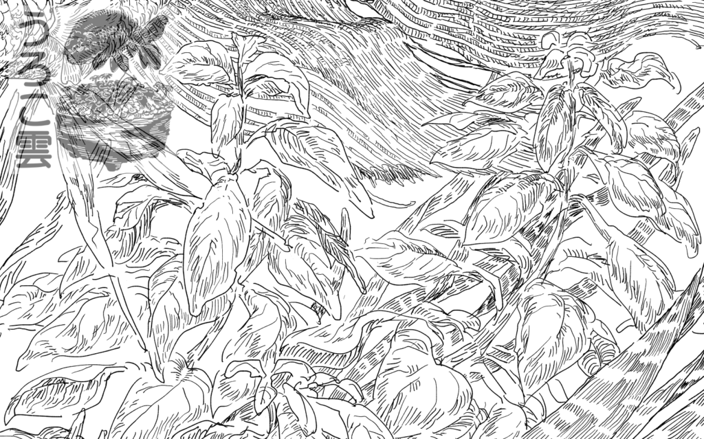 デジタルイラストとして作成し,キャンバスに印刷する関係上,粗い解像度では詳細が見苦しくなる可能性もあるほか,自分の作風が線画を細かく積み重ねるもののため,近くまで寄ってよくよく観察してもらう鑑賞様式に仕向けたいという思いもありました.