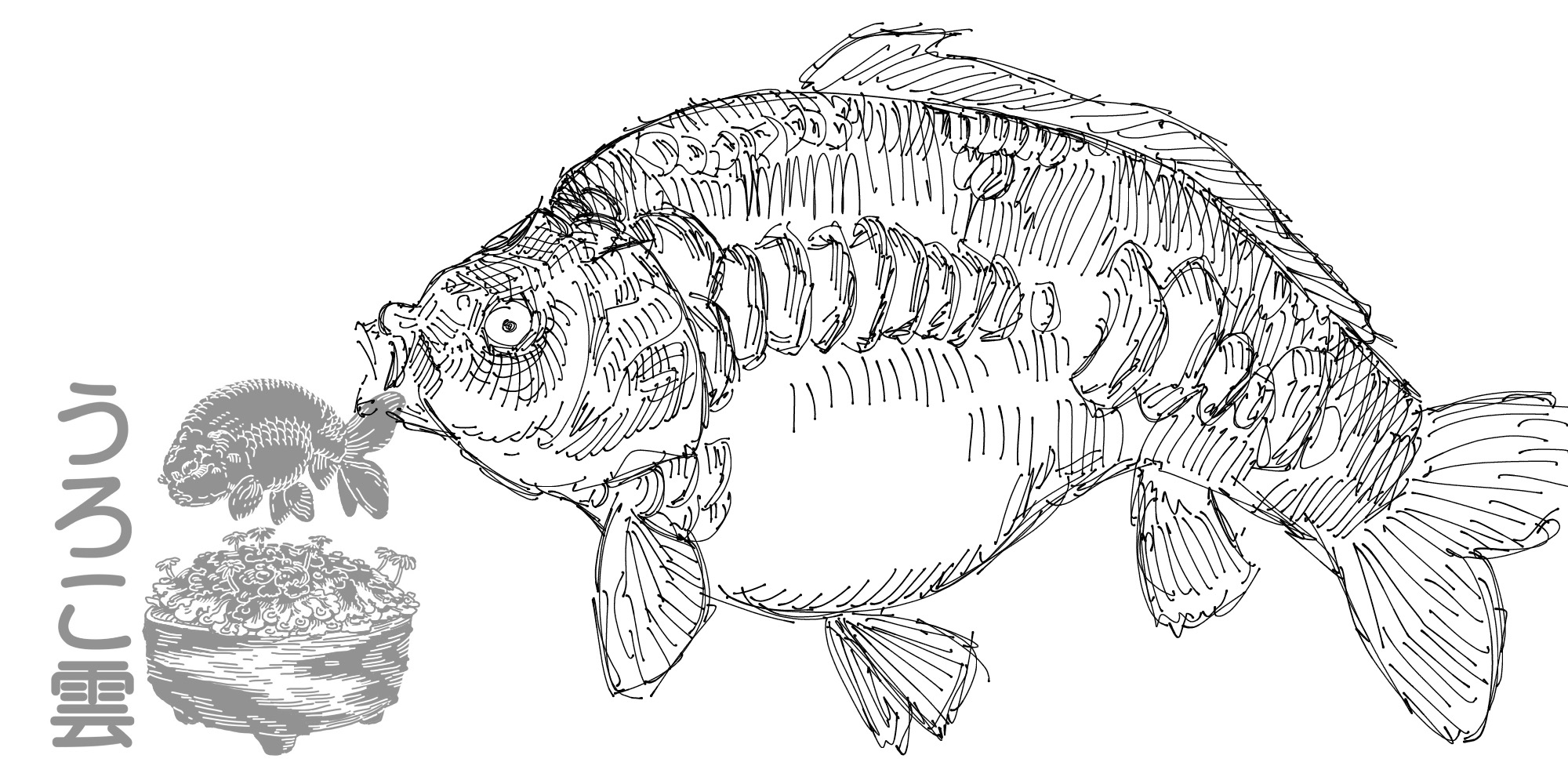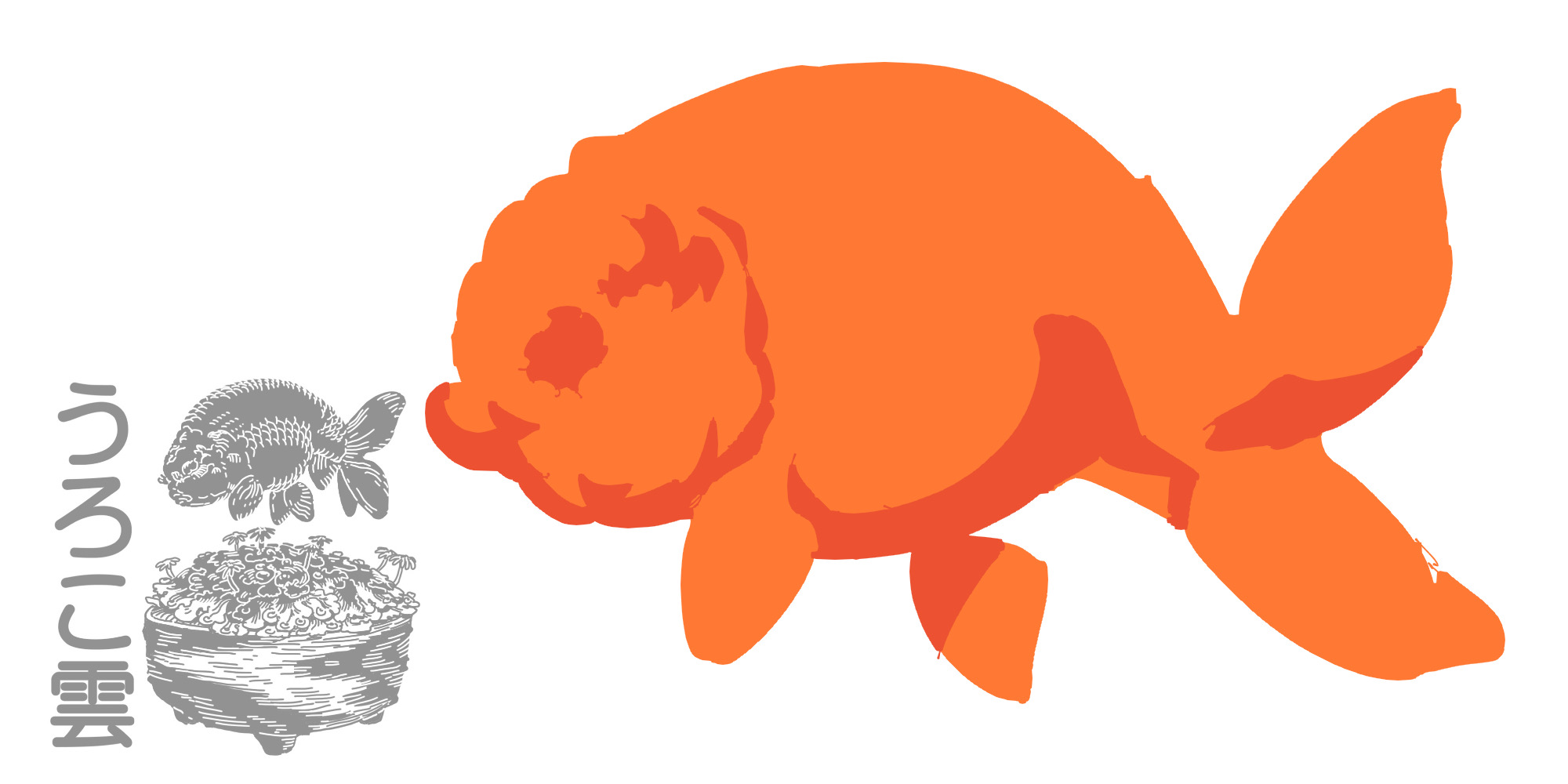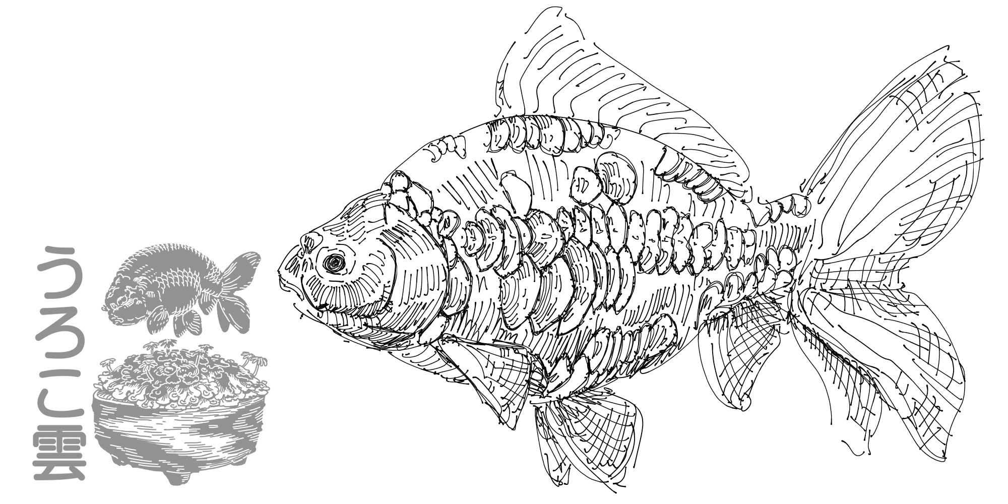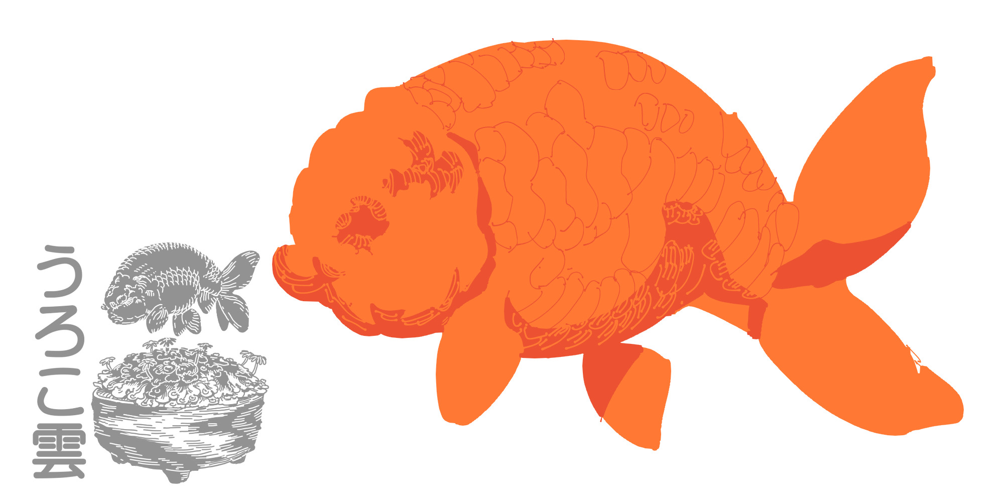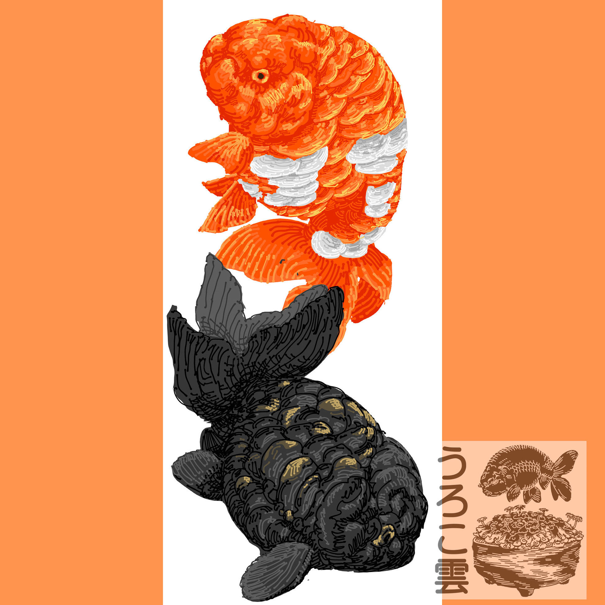 らんちゅうは鱗の状態にかかわらず丸くて寸胴の場合が多いです(協会系のもののように,背がまっすぐ伸びて大きく育つもののあります)から,壁紙サイズの19.5:5の中に余分な空白なく収めるには胴が短すぎますので,縦に2匹並べる方針で行きます.それぞれに動きを付けるとなると互いの尾ヒレを追う太極図のような構図が雰囲気も出て無難でしょう.ドラゴンスケールのイラスト特有の昇り竜のような雰囲気とも調和します.