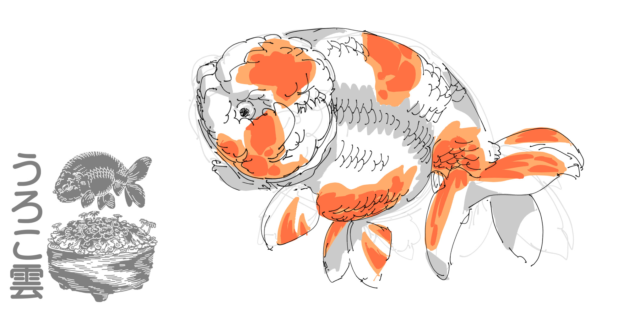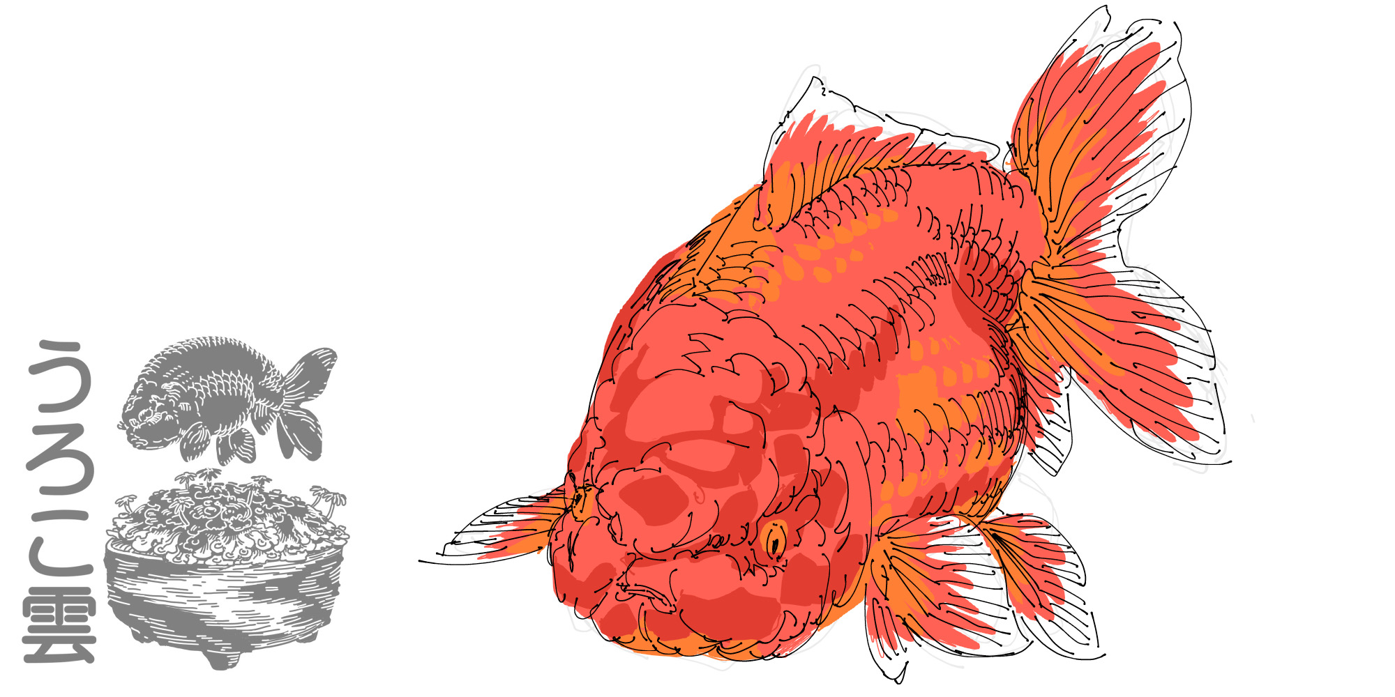 背びれを持たず,肉瘤によって頭から胴体まで丸々とした形になる金魚です.背びれのない金魚としてもっとも有名な品種ですが,近年背びれのついた「セルフィンらんちゅう」といった品種が作出されるなど,人気のあまり訳が分からないことになっている品種でもあります.