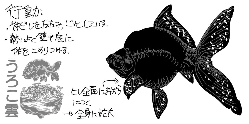 ウオノカイセンチュウが繁殖して体液を吸い取り,体表の白い粒やかゆみによる不健康な泳ぎ方,衰弱死を招きます.新しく購入した金魚が持ち込む,水温低下により以前から潜伏していたセンチュウが活性化して発症するなどして顕在化します.治療としてはメチレンブルーやアグテンによる駆除,水温上昇による繁殖サイクル阻害,塩水浴による体力温存があげられます.