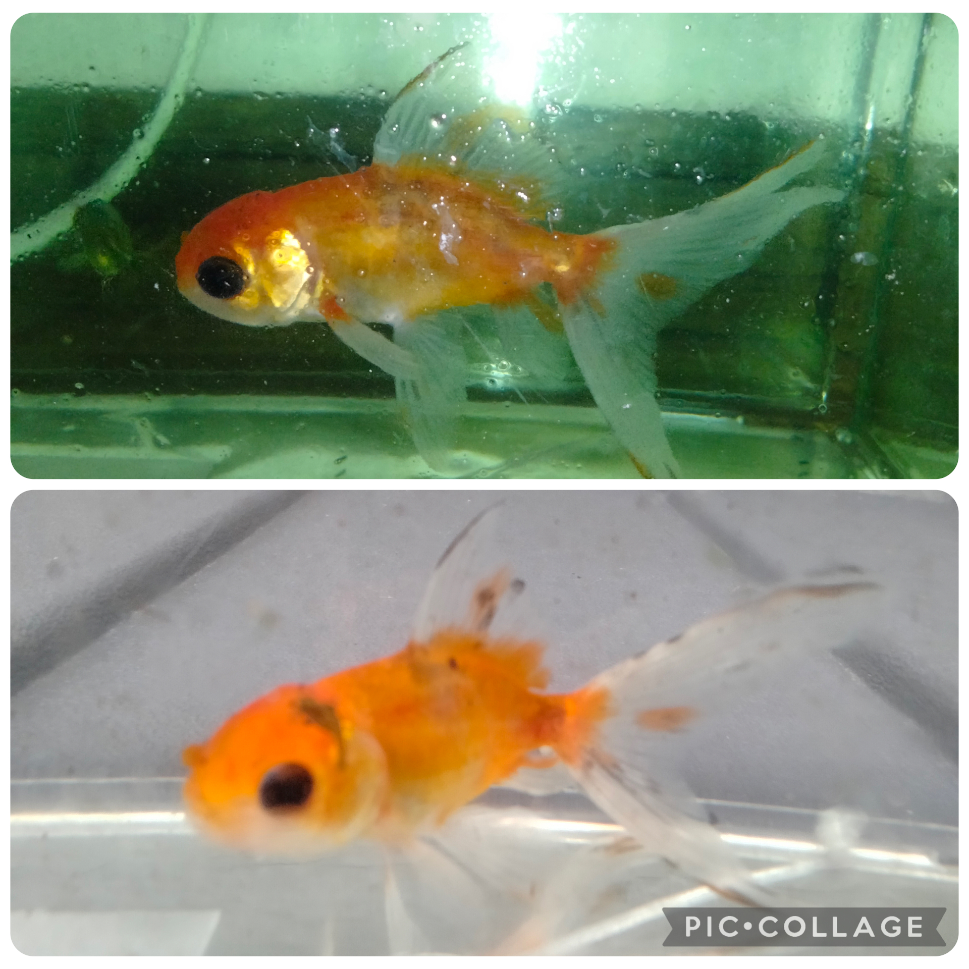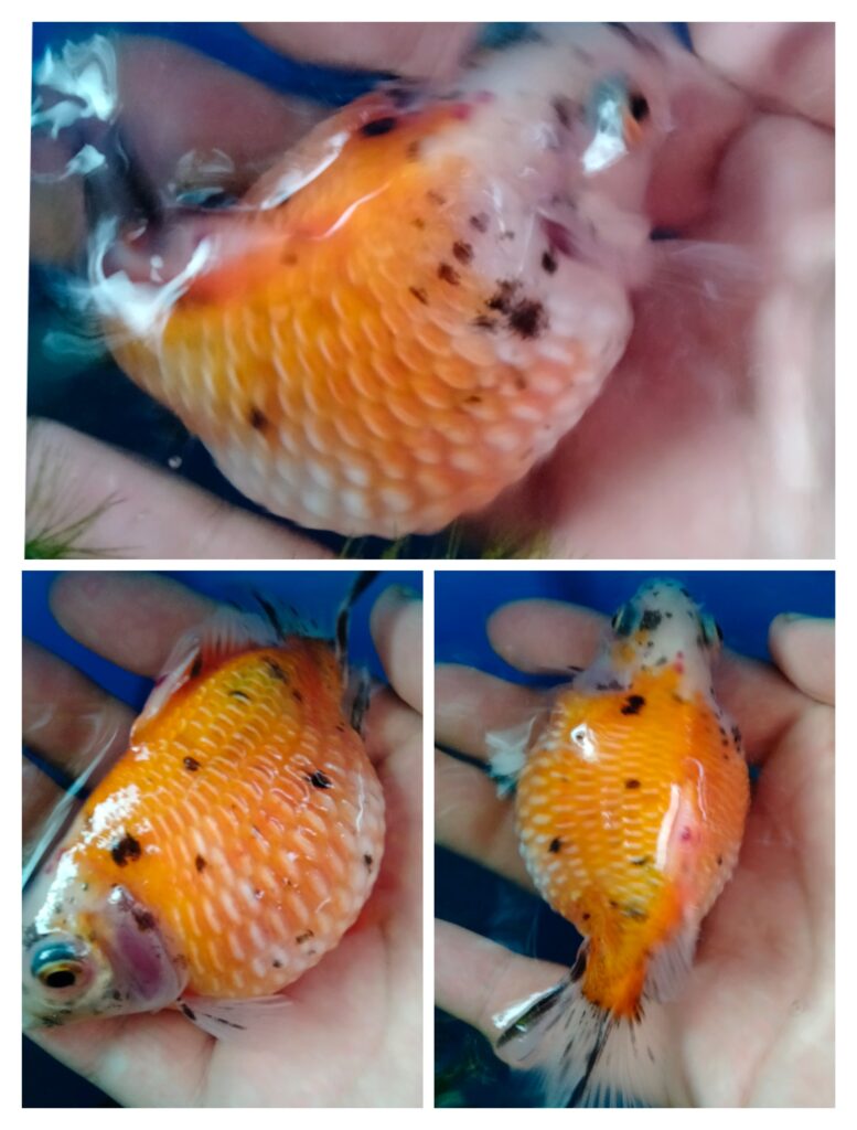 上の画像のピンポンパールにチマメのような血赤色の点があるのが見つけられるでしょうか?この頭頂部と背びれ前方にあるようなチマメが赤斑症の症状で,水質悪化,免疫低下によるエロモナス症の一つです.新しく立ち上げてろ過微生物の定着が進んでいない,水質が不安定な水槽では特に注意が必要で,対応としては水替え,塩水浴などがあります.