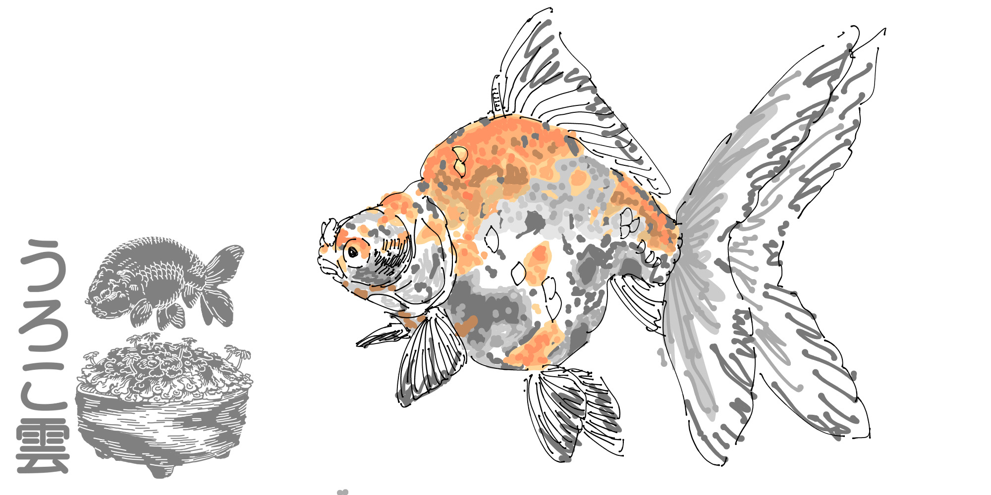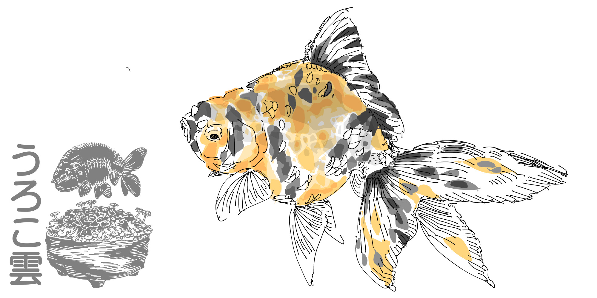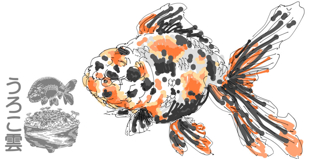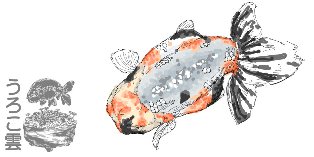キャリコ柄の長物金魚の代表格であり,三色出目と和金の交配である,ギンブナの血筋があるなど複雑な血筋の金魚です.