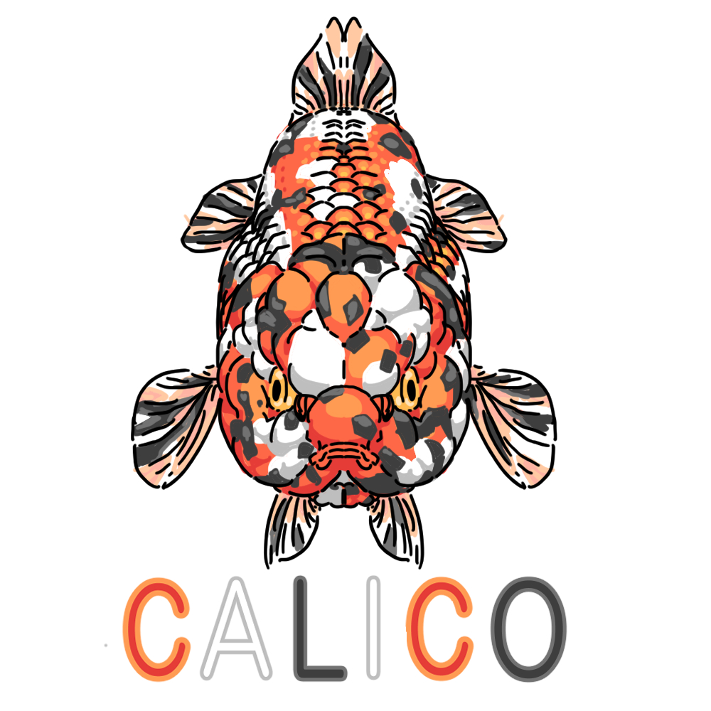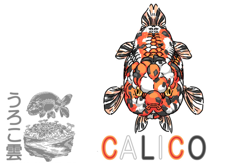 キャリコ柄の琉金で,琉金と三色出目の交配によって作出されました.「キャリコ」とだけ表記された品種は通常このキャリコ琉金です.