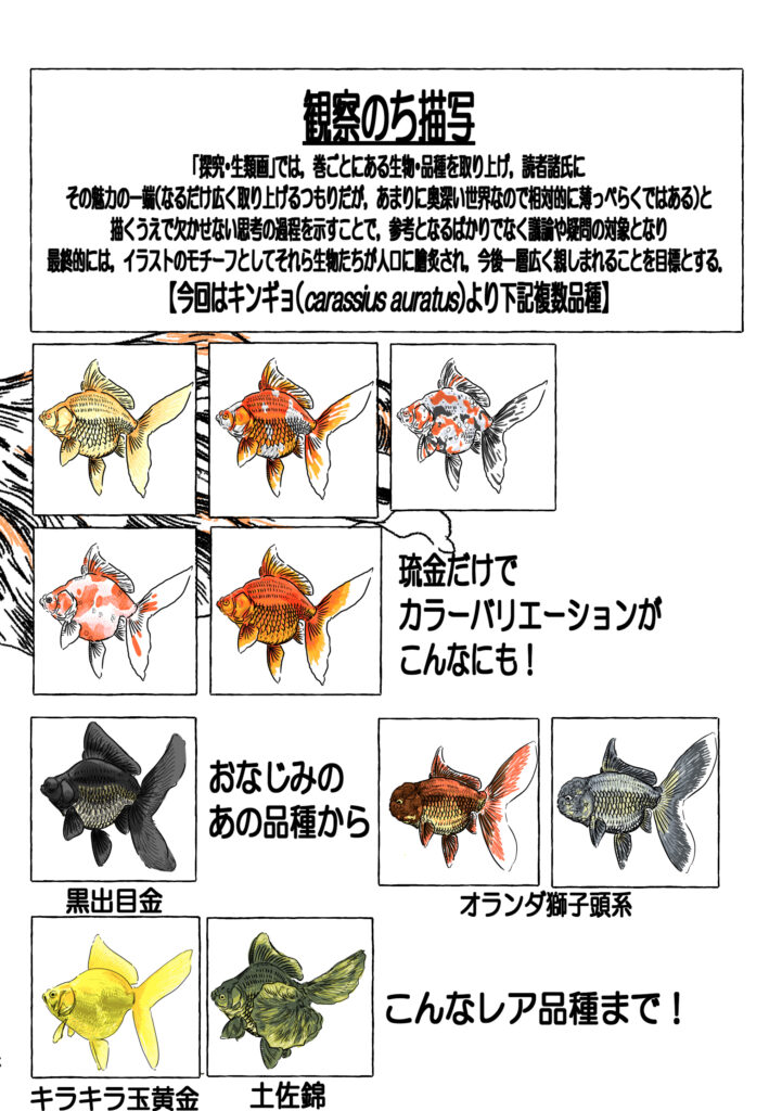 上記記載の本誌目次のとおり,まずは琉金を通じて金魚の面白みの深さ・広さを体感してもらった後,後半ではその他有名な品種(出目金/らんちゅう/ピンポンパール)からレア品種(キラキラ玉黄金/土佐錦)まで,金魚の多様性の広大さを楽しむ構成とした.